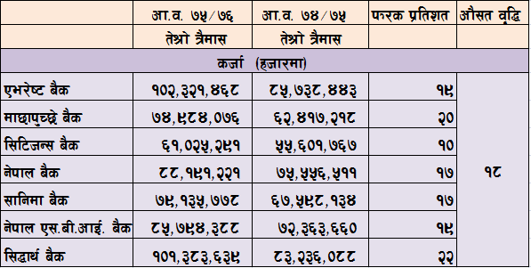 ७ वाणिज्य बैंकको कर्जा औसतमा १८ प्रतिशतले वृद्धि भएको छ। ७ वाणिज्य बैंक मध्य सबै भन्दा धेरै सिद्धार्थ बैंकको कर्जा २२ प्रतिशतले वृद्धि भएको छ।