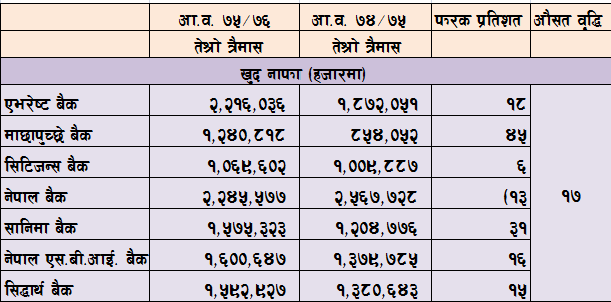 ७ वाणिज्य बैंकको खुद नाफा औसतमा १७ प्रतिशतले वृद्धि भएको छ। माछापुच्छ्रे बैंकले आफ्नो खुद नाफा ४५ प्रतिशतले वृद्धि गर्दै १ अर्ब २४ करोड पुर्याएको छ। गत आर्थिक वर्षको तेश्रो त्रैमासमा बैंकले ८५ करोड ४० लाख खुद नाफा गरेको थियो। नेपाल बैंक लिमिटेडको खुद नाफा भने १३ प्रतिशतले कम भएको छ। नेपाल बैंकले चालु आर्थिक वर्षको तेश्रो त्रैमास सम्म २ अर्ब २४ करोड कमाएको छ , बैंकले अघिल्लो आर्थिक वर्षको तेश्रो त्रैमासमा २ अर्ब ५६ करोड कमाएको थियो।