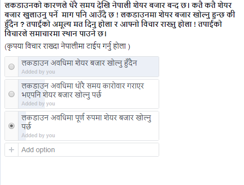 यसै बीच हामीले शेयर बजारको चर्चित फेसबुक ग्रुप SHARE BAZAR (शेयर बजार, बिचार हजार) मा सर्वेक्षण गरेका थियौ। सो ग्रपमा लगानीकर्तालाई सोधिएको प्रश्न यस प्रकार थियो :