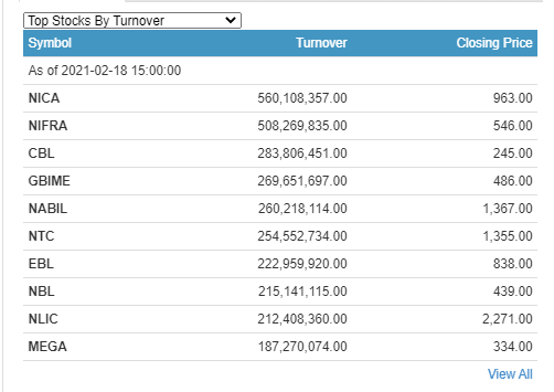 ग्लोबल आइएमई बैंकको २६ करोड ९६ लाखमाथिको शेयर कारोबार भएको छ । नविल बैंकको २६ करोडमाथिको शेयर कारोबार भएको छ । नेपाल टेलिकमको २५ करोड ४५ लाख रुपैयाँमाथिको शेयर करोबार भएको छ ।