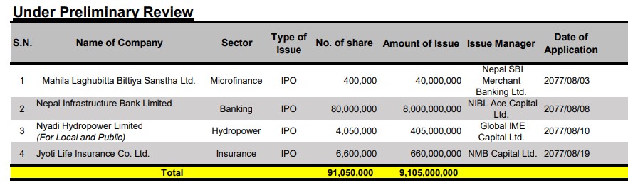 काठमाडौं । देशकै ठूलो नेपाल इन्फास्ट्रक्चर बैंक आठ करोड कित्ता आईपिओ निष्काशन गर्न नेपाल धितोपत्र बोर्डमा अनुमतिको लागि पुगेको छ ।