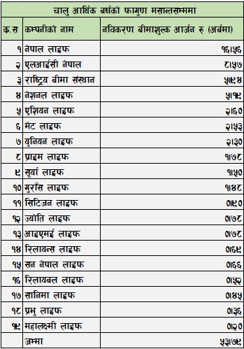 समितिको तथ्याङ्क अनुसार फागुन मसान्तसम्ममा सबैभन्दा धेरै नेपाल लाइफ इन्स्यारेन्सले नविकरण बीमाशुल्क आर्जन गर्न सफल भएको छ । कम्पनीले समिक्षा अवधिमा १६ अर्ब ५६ करोड रुपैयाँ नविकरण बीमाशुल्क आर्जन गरेको हो । दोस्रोमा लाइफ इन्स्योरेन्स कर्पोशन नेपाल रहेको छ । कम्पनीले ८ महिनाको अवधिसम्ममा ८ अर्ब ५७ करोड रुपैयाँ नविकरण बीमाशुल्क आर्जन गर्न सफल भएको छ ।