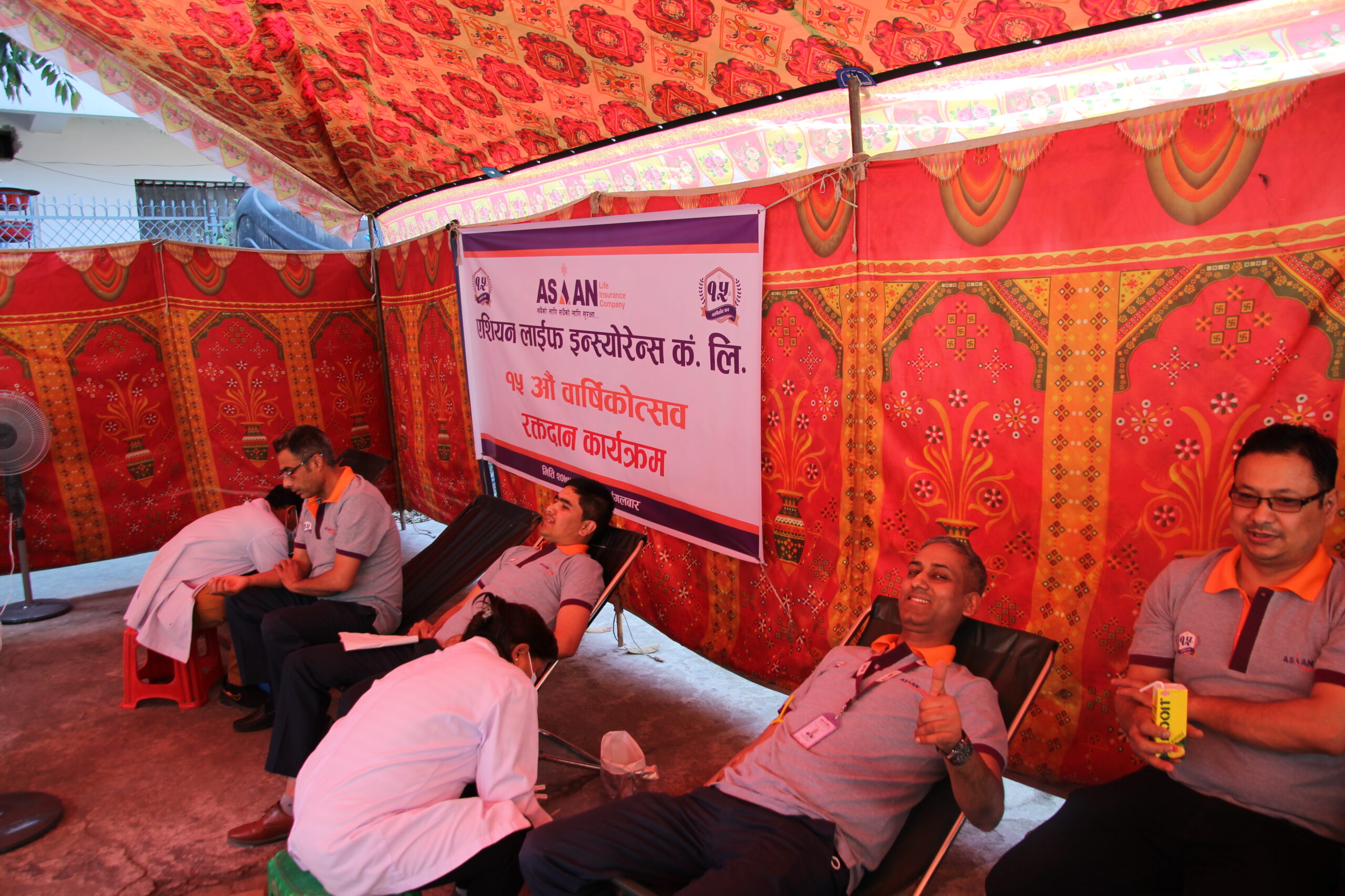 काठमाण्डाै । एशियन लाईफ इन्स्याेरेन्सकाे १५ औं वार्षिकाेत्सवका अवसरमा मंगलबार आयाेजित रक्तदान कार्यक्रममा ४६ जनाले रक्तदान गरेका छन् । नेपाल रेडक्रस साेसाइटी,कालीमाटीकाे प्राविधिक सहयाेगमा कम्पनीकाे मैतीदेवीस्थित प्रधान कार्यालय परिसरमा रक्तदान कार्यक्रम आयाेजना गरिएकाे थियाे ।