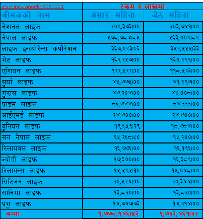गत आर्थिक बर्षको असार मसान्त सम्ममा जीवन बीमा कम्पनीहरुको लगानी करिब पौने दुई खर्ब पुगेको छ । नेपालमा सञ्चालित १८ जीवन बीमा कम्पनीमध्ये १७ जीवन बीमा कम्पनीको लगानी १ खर्ब ७७ अर्ब ८१ करोड ४६ लााख ५३ हजार रुपैयाँ पुगेको हो । गत जेठ महिनासम्ममा कम्पनीहरुको लगानी १ खर्ब ७२ अर्ब ३४ करोड ६१ लााख २२ हजार रुपैयाँ रहेको थियो ।