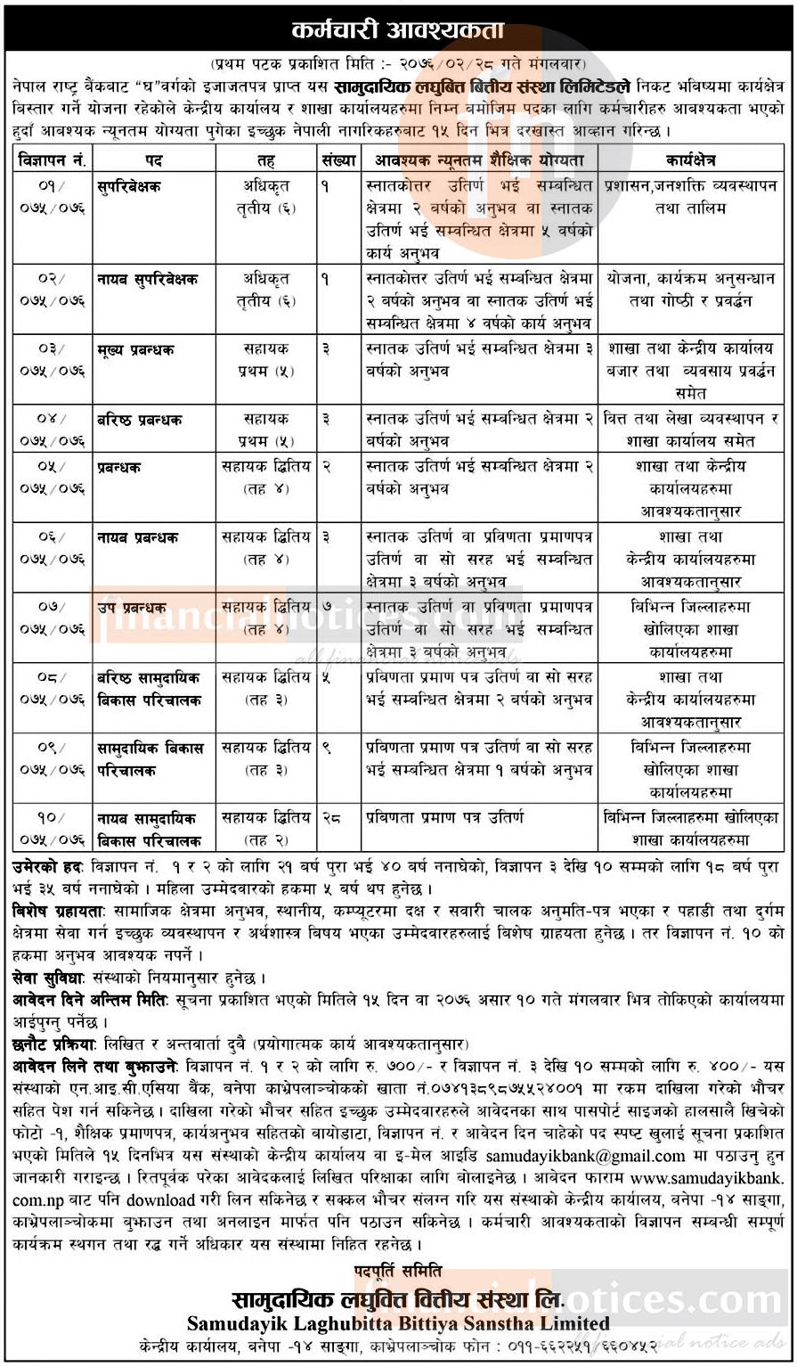 त्यस्तै, संस्थाले मूख्य प्रबन्धक पदमा ३ जना, वरिष्ठ प्रबन्ध पदमा ३ जना, प्रबन्धक पदमा २ जना, नायब प्रबन्धक पदमा ३ जना ,उप प्रबन्धक पदमा ७ जना, वरिष्ठ सामुदायिक विकास परिचालक पदमा ५ जना, सामुदायिक विकास परिचालक पदमा ९ जना र नायव सामुदायिक विकास परिचालक पदमा २८ जना कर्मचारी माग गरेको छ ।