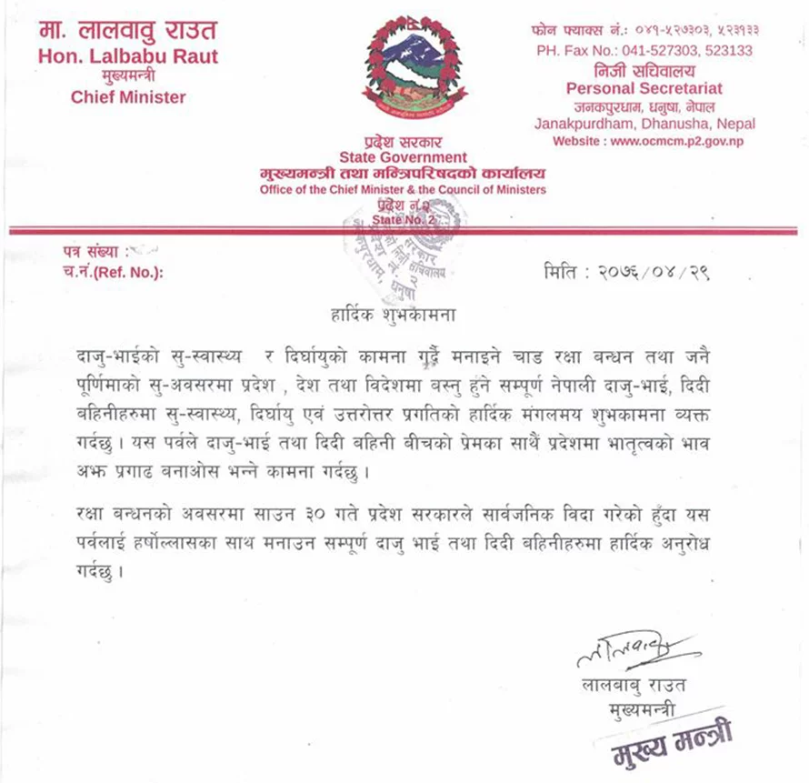 काठमाडौं । प्रदेश नं २ सरकारले बिहीबार (भोलि) सार्वजनिक बिदा दिने निर्णय गरेको छ । हिन्दुधर्मालम्बीहरूको पर्व रक्षाबन्धनको अवसर पारेर प्रदेश २ सरकारले बिहिबार सार्वजनिक बिदा दिने निर्णय गरेको जनाएको छ ।