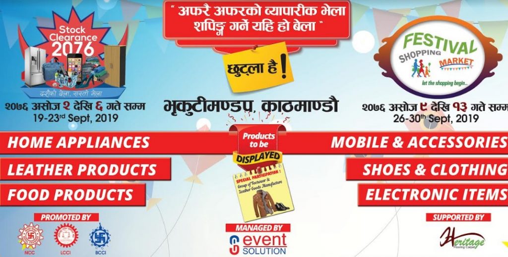 ‘अफरै अफरको ब्यापारिक भेला, शपिगं गर्ने यहि हो बेला’ भन्ने नाराका साथ सञ्चालन हुने फेस्टिवल मार्केटमा घरायसी प्रयोजनका सम्पूर्ण सामाग्री, खाद्यान्न, छालाका उत्पादनहरु, खानाका परिकार तथा उत्पादन, कपडा, जुत्ता, ह्याण्डीक्राफ्ट, इलेक्ट्रोनिक्स लगायत सामाग्रीका सयभन्दा बढी स्टलहरु रहने आयोजक संस्था इभेण्ट सोलुसनका बजार निर्देशक नविन भट्टले बताए ।