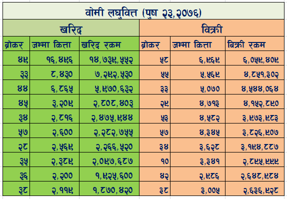 आज ४९ नम्बर ब्रोकरबाट वोमी लघुवित्तको सर्वा्धिक १ करोड ४७ लाख बराबरको १६ हजार ४ सय ९६ कित्ता शेयर खरिद भएको छ ।