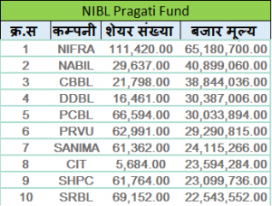 एनआईबिएल प्रगति फण्डले १० वटा कम्पनीमा ३२ करोड ७९ लाख रुपैयाँ लगानी गरेको छ । फण्डले सबैभन्दा धेरै इन्फ्रा र नविल बैंकको शेयरमा लगानी गरेको देखिन्छ ।