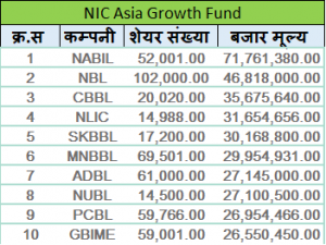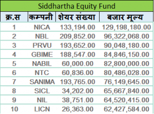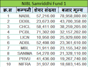 एनआईविएल समृद्धि फण्डले सबैभन्दा धेरै नविल बैंकको शेयरमा ७ करोड ८९ लाख रुपैयाँ लगानी गरेको छ । यस फण्डले सबैभन्दा धेरै लगानी भएका १० कम्पनीमा मात्रै ३२ करोड ४८ लाख रुपैयाँ लगानी गरेको देखिन्छ ।