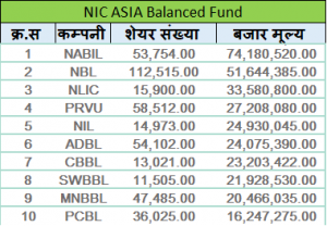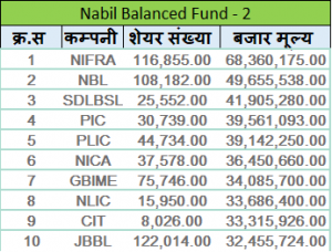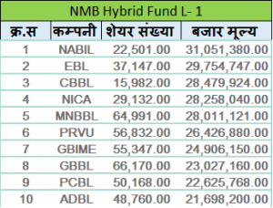 एनएमबी हाइब्रिड फण्ड एल एकले सबैभन्दा धेरै नविल बै्कको शेयरमा तीन करोड १० लाख रुपैयाँ लगानी गरेको छ । फण्डले १० वटा कम्पनीमा मात्रै २६ करोड ४२ लाख रुपैयाँको लगानी गरेको छ ।