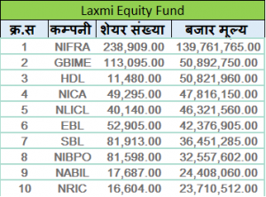 लक्ष्मी इक्वीटी फण्डले १० वटा कम्पनीहरुमा मात्रै ४९ करोड ५१ लाख रुपैयाँको लगानी गरेको छ । फण्डले सबैभन्दा धेरै इन्फ्राको शेयरमा १३ करोड ९७ लाख रुपैयाँ लगानी गरेको छ ।