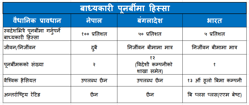 अर्को छिमेकी मुलुक बंगलादेशमा समेत जीवन बिमा व्यवसायको हकमा स्वदेशी पूनर्बीमकसँग अनिवार्य बिमा गर्नुपर्ने प्रावधान छैन । बंगलादेशको बिमा विकास तथा विनियामक प्राधिकरण(आइडिआरए) ले निर्जीवन बीमा व्यवसायको ५० प्रतिशत अनिवार्यरुपमा सरकारी पूनर्बीमक साधारण बिमा कर्पोरेशन(एसबिसी)सँग गर्नुपर्ने प्रावधान तोकेको छ । तर जीवन बीमा व्यवसायको हकमा स्वदेशभित्रै अनिवार्य पूनर्बीमा गर्नुपर्ने प्रावधान छैन ।