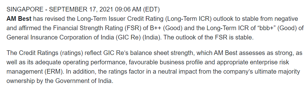 अन्तर्राष्ट्रिय क्रेडिट रेटिङ एजेन्सी एएम वेष्टले गरेको अध्ययन अनुसार जिआइसी विश्वकै तेह«ौं ठूलो बीमक हो । यसबाहेक एएम वेष्टले यसको वित्तीय जोखिम मूल्यांकन गरेर बि प्लसप्लस(गुड) स्थिर सबलतामा वर्गिकरण गरेको छ ।