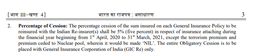 भारतीय बिमा विनियामक तथा विकास प्राधिकरण(आइआरडिएआइ) सामान्य(निर्जीवन बिमा) व्यवसायको ५ प्रतिशत अनिवार्यरुपमा भारतीय पूनर्बीमक विश्वकैे जिआइसीमार्फत् गर्नुपर्ने प्रावधान तोकेको छ । यो अनिवार्य सीमाभित्र आतंकवाद र नाभिकिय समूह(न्युक्लियर पुल)को व्यवसायलाई समावेश गरिएको छैन । साथै जीवन बीमा व्यवसायको पूनर्बीमाको लागि पनि भारतीय नियामक निकायले बिमकलाई स्वदेशी पूनर्बीमकसँगै गर्नुपर्ने व्यवसायको बाध्यकारी व्यवस्था गरेको छैन ।