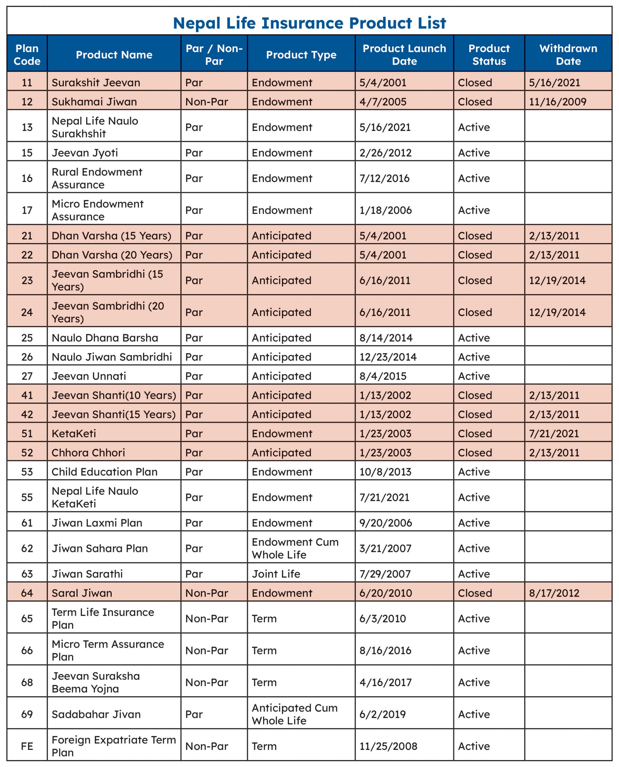 कम्पनीले स्थापनाकालदेखि आजसम्मको दिनमा २८ वटा बीमा योजना ल्याइसकेको छ । जस मध्ये आजका दिनमा ११ वटा योजना बन्द भइसेकका छन् भने आजका दिनमा १७ वटा मात्रै सक्रिय छन् ।