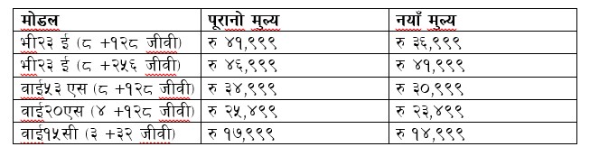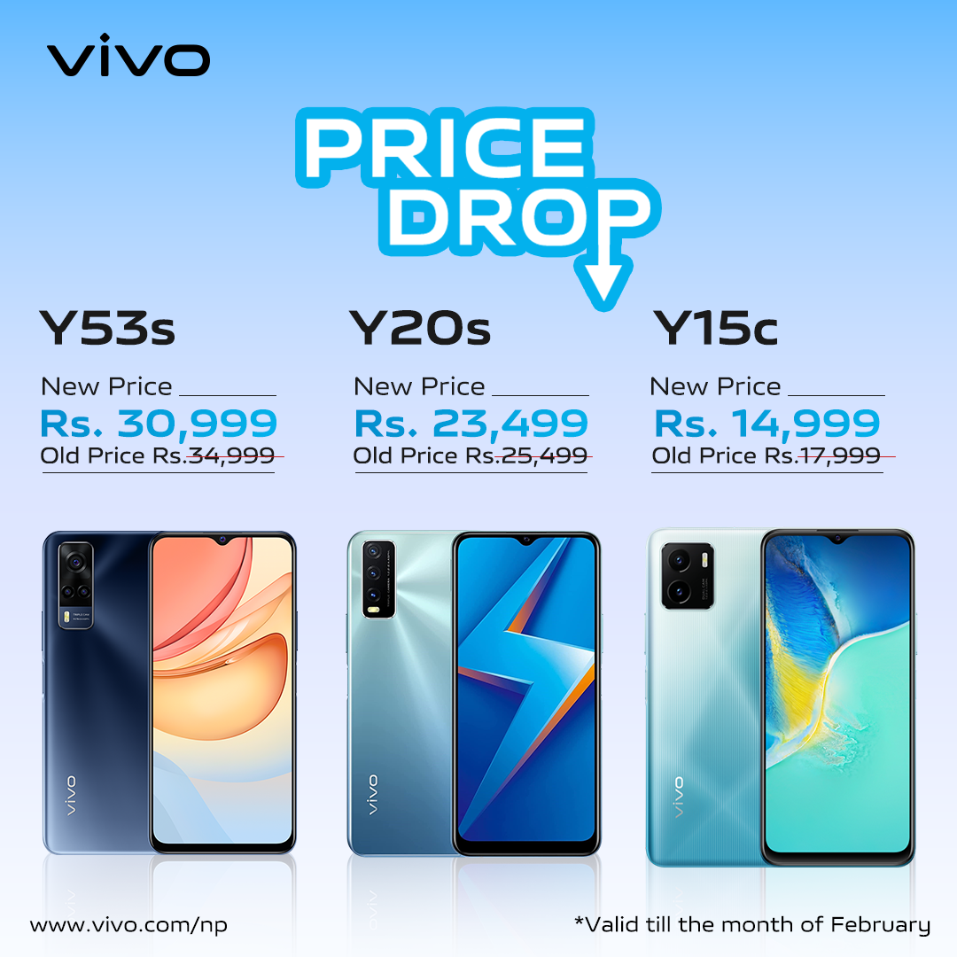 काठमाडौं। । भिभो, एक अग्रणी ग्लोबल टेक्नोलोजी ब्रान्डले आफ्नो भी र वाई सिरिजका चारवटा स्मार्टफोनहरुको मुल्य घटाएको छ । भिभोले भी२३ई (१२८जीवी र २५६ जीवी), वाई५३एस, वाई२०एस, र वाई१५सी को मूल्य भारी मात्राले घटाएको हो । यस नयाँ मूल्य १ फेब्रुअरी २०२३ देखि २८ फेब्रुअरी २०२३ सम्म नेपालका सबै रिटेल स्टोर र इ–कमर्स वेबसाइटहरूमा लागू हुनेछ ।