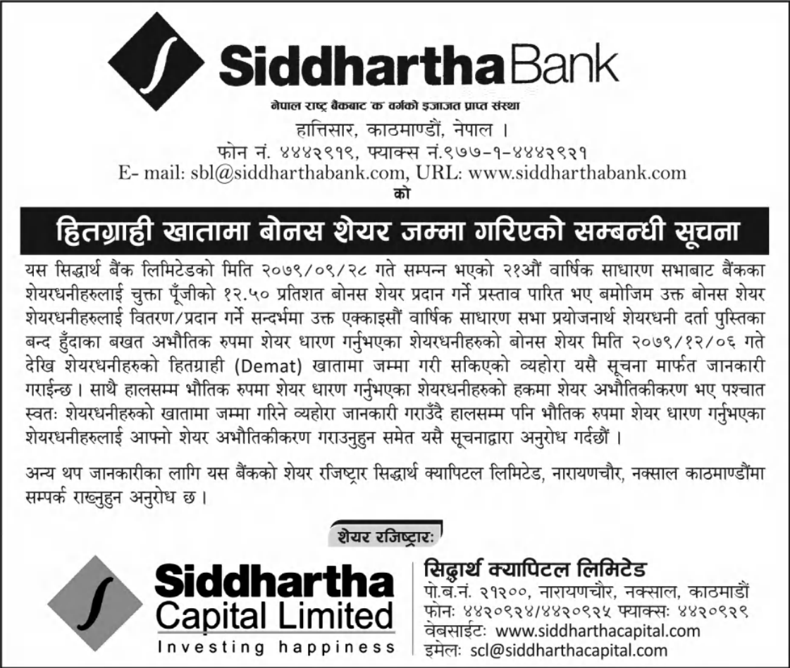 काठमाडौं । सिद्धार्थ बैंकले लिमिटेडले शेयरधनीको हितग्राही खातामा बोनश शेयर जम्मा गरेको छ । बैंकले पुस २८ गते सम्पन्न वार्षिक साधारण सभाबाट पारित १२ दशलमव ५० प्रतिशत बोनश शेयर शेयरधनीको हितग्राही खातामा जम्मा गरेको हो ।