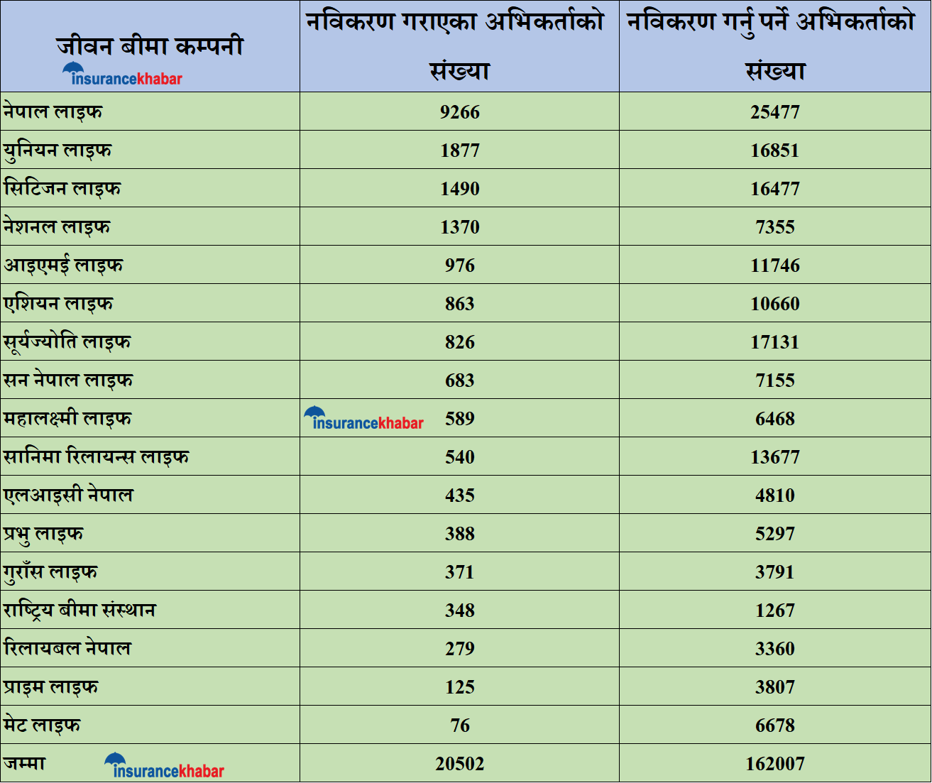 अहिलेसम्म सबैभन्दा धेरै नेपाल लाइफका अभिकर्ता नविकरण गराएका छन् । हालसम्म २५ हजार ४७७ जना मध्ये ९ हजार २६६ जनाले नविकरण गराएका छन् । त्यस्तै दोस्रो धेरै युनियन लाइफका अभिकर्ताले नविकरण गराएका छन् । युनियन लाइफमा १६ हजार ८५१ मध्ये १८७७ जनाले मात्रै नविकरण गराएका छन् ।