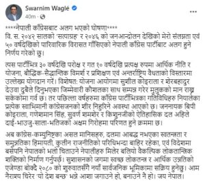 काठमाडौं । नेपाली काँग्रेसका नेता एवम अर्थशास्त्री स्वर्णिम वाग्लेले नेपाली कांग्रेस छाडेका छन् । उनले सामाजिक सञ्जाल फेसबुकमा स्टाटस लेख्दै आफू कांग्रेसबाट टाढा भएको घोषणा गरेका हुन् ।