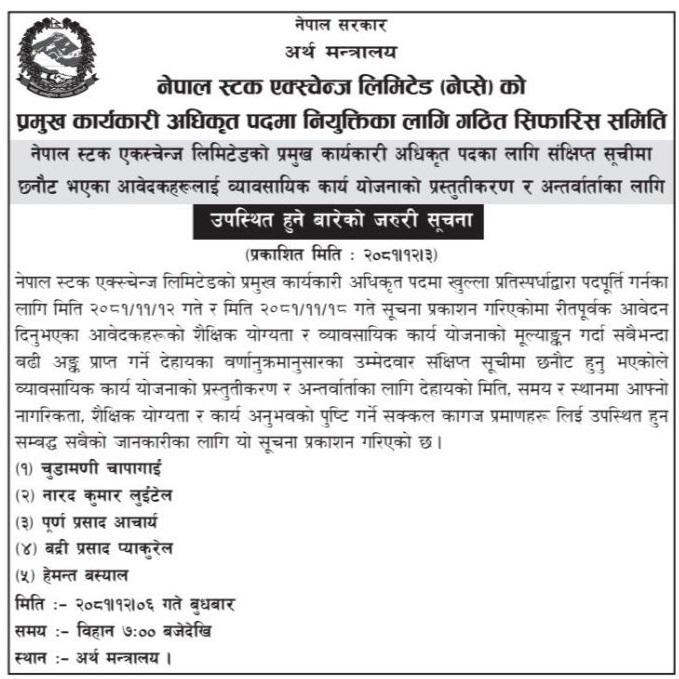 अर्थ मन्त्रालयद्वारा गठित सिफारिस समितिले नेप्सेको सीईओका लागि परेका १० आवेदकमध्ये ५ जनाको नाम सर्टलिस्ट गरेको हो। सर्टलिस्टमा चूडामणि चापागाइँ, नारदकुमार लुइँटेल, पूर्णप्रसाद आचार्य, बद्रीप्रसाद प्याकुरेल र हेमन्त बस्याल पर्न सफल भएका छन्।