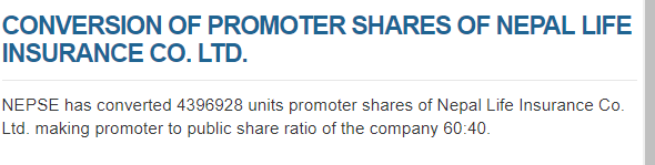 नेपाल लाइफ इन्स्योरेन्स कम्पनिको ४३ लाख ९५ हजार कित्ता संस्थापक सेयर साधारण सेयरमा परिणत भएको छ ।
