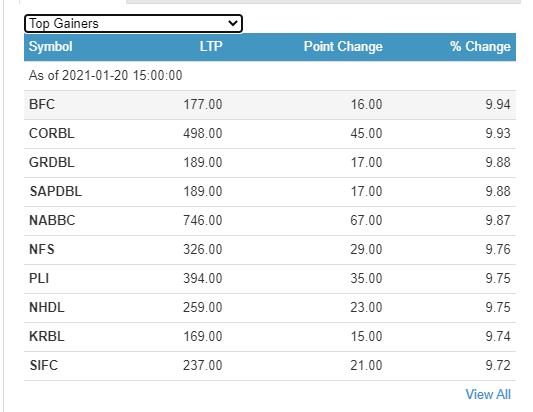 काठमाडौं । नेप्से १५ दशमलव ८७ अंकले बढेर २३४२ दशमलव ७६ को विन्दुमा कायम भएको छ । बैंकिङ, ट्रेडिङ, होटल, उत्पादनमूक क्षेत्र र अन्य बाहेक आज अरु उपसूचकमा हरीयाली छाएको छ ।