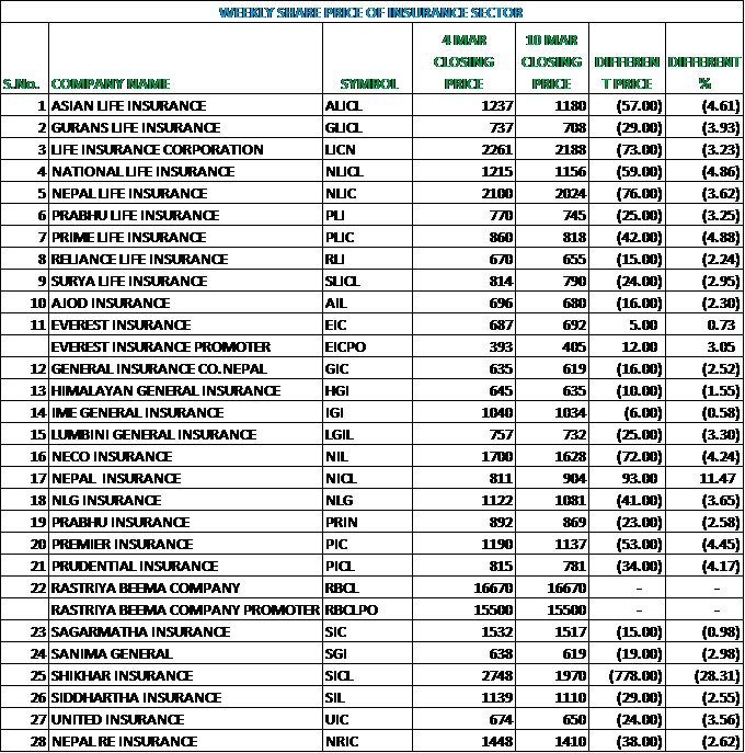 यस साता एभरेष्ट इन्स्योरेन्सको संस्थापक तथा सर्वसाधारण दुबै समुहको शेयर मूल्य सुधार भएको छ। सर्वसाधारण समुहको शेयर मूल्य ६९२ रुपैयाँ पुगेको छ भने संस्थापकको ४०५ रुपैयाँ पुगेको छ। त्यस्तै यस साता नेपाल इन्स्योरेन्सको शेयर ९३ रुपैयाँले बढेको छ।