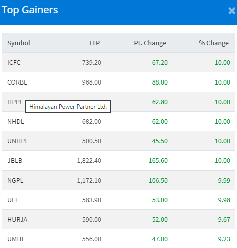 त्यस्तै, आज आइसीएफसी फाइनान्स कम्पनी, कपोैरेट डेभलपमेन्ट बैंक, हिमालयन पावर पार्टनर, नेपाल हाइड्रो डेभलपर्स, यूनियन हाइड्रोपावर, जीवन बिकास लघुवित्तका लगानीकर्ताले १० प्रतिशतका दरले कमाएका छन् । त्यस्तै, ङादी ग्रुप, यूनियन लाइफ इन्स्योरेन्स कम्पनी,हिमालयन उर्जा विकास र यूनाइटेड मोदी हाइड्रोपावरका लगानीकर्ताले ९ प्रतिशतभन्दा बढीका दरले कमाएका छन् ।