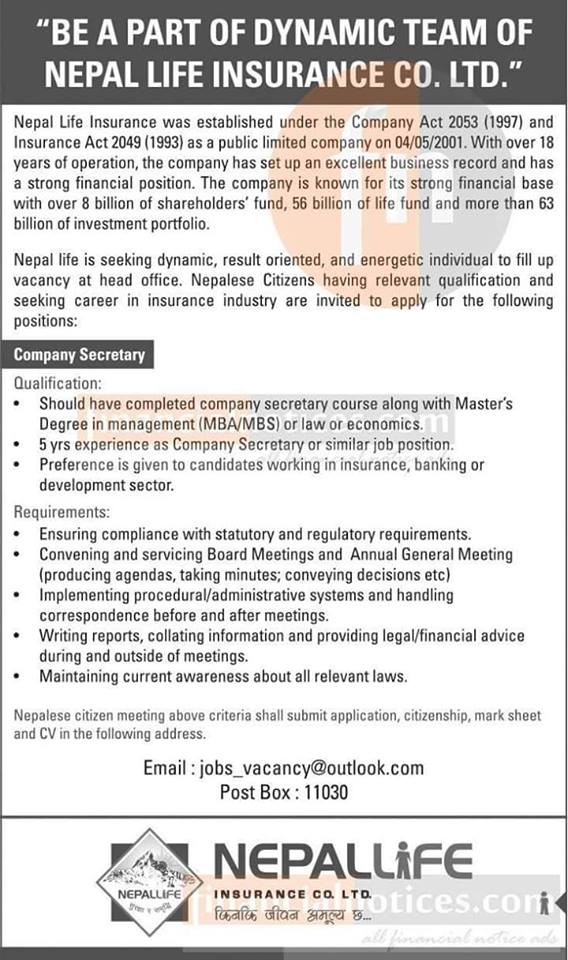 नेपाल लाइफ इन्स्योरेन्स कम्पनीमा रोजगारी खूलेको छ । कम्पनीले एक विज्ञापन जारी गर्दै कम्पनी सेक्रेटरी पदका लागि दरखास्त आहवान गरेको छ ।