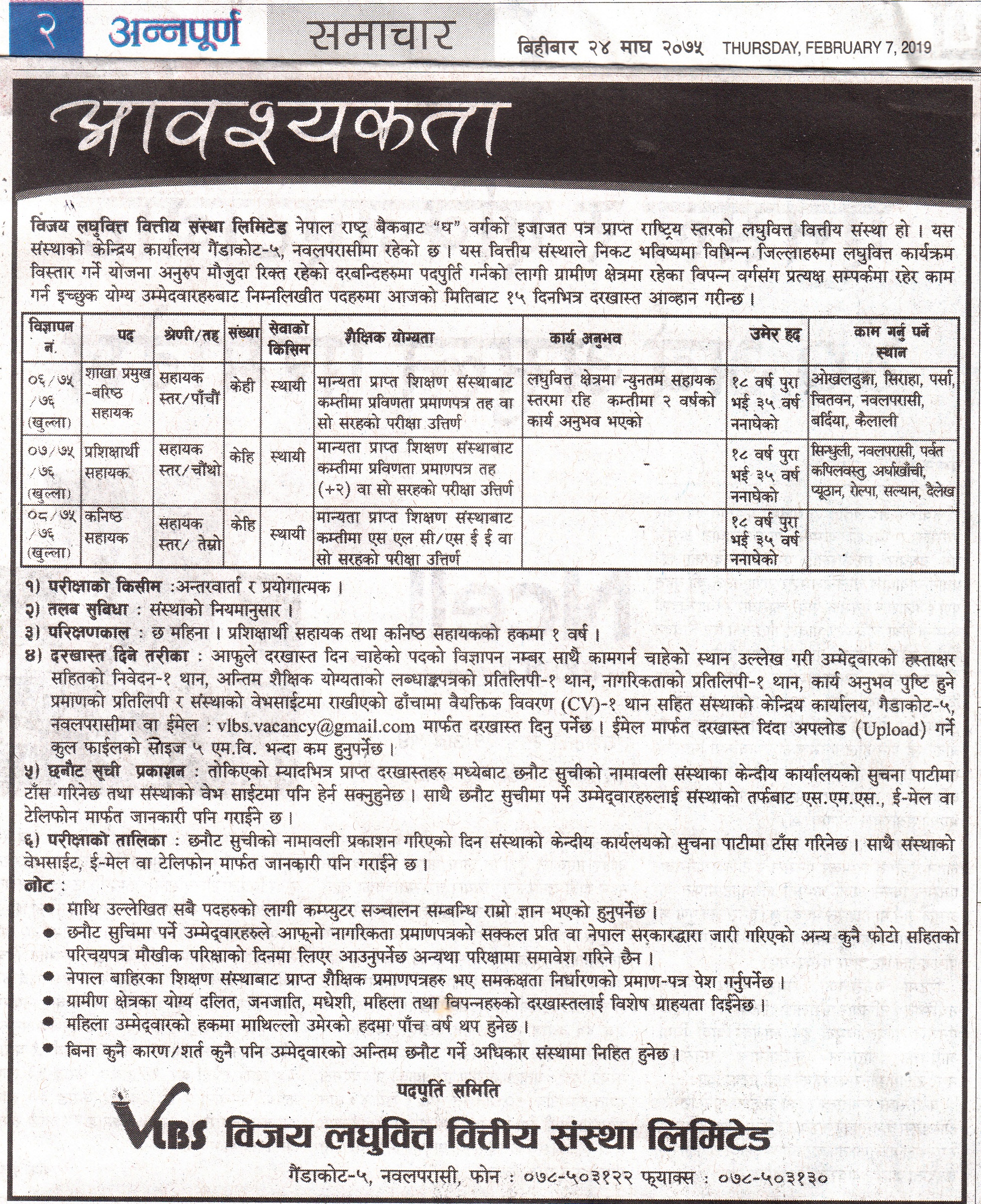 विजय लघुवित्त वित्तीय संस्थामा कनिष्ठ सहायक पद देखि शाखा प्रमुख पदका लागि रोजगारको अवसर
