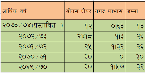 आर्थिक वर्ष ७३/७४ को नाफा बाट १२ प्रतिशत बोनस प्रस्ताव गरेकोमा सो बोनस शेयर पश्चात कम्पनीको पुँजी १ अर्ब ४८ करोड पुग्नेछ । त्यसपछि पनि अझै कम्पनीले आफ्नो पुँजी ३४ प्रतिशतले वृद्धि गर्नु पर्ने छ ।