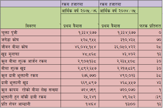 लाईफ इन्स्योरेन्स कर्पोरेशन नेपाल लिमिटेडको आर्थिक वर्ष २०७५/७६कोे प्रथम त्रैमासको वित्तिय विवरण :