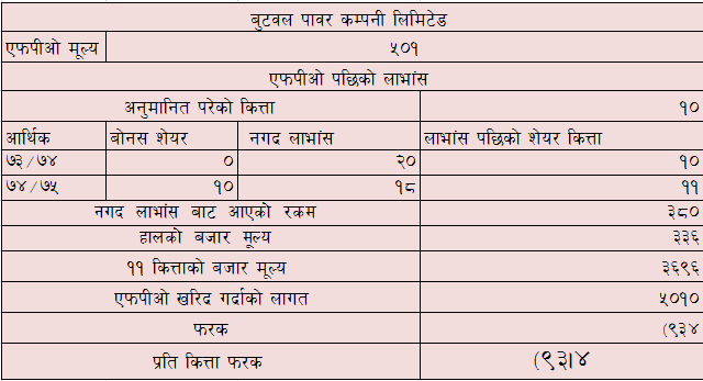 बुटवल पावर कम्पनीले १०० रुपैयाँ अंकित मुल्यमा ४०१ रुपैया प्रिमियम थपी प्रति कित्ता ५०१ मा थप सार्वजनिक निष्काशन गरेको थियो । उदाहरणको लागि त्यो बेला तपाईले १० कित्ता एफपीओ पार्नु भएको थियो भने तपाई अहिले ९३४ रुपैया नोक्सानीमा हुनुहुन्छ भने प्रति कित्ता ९३ रुपैया नोक्सानीमा हुनुहुन्छ ।