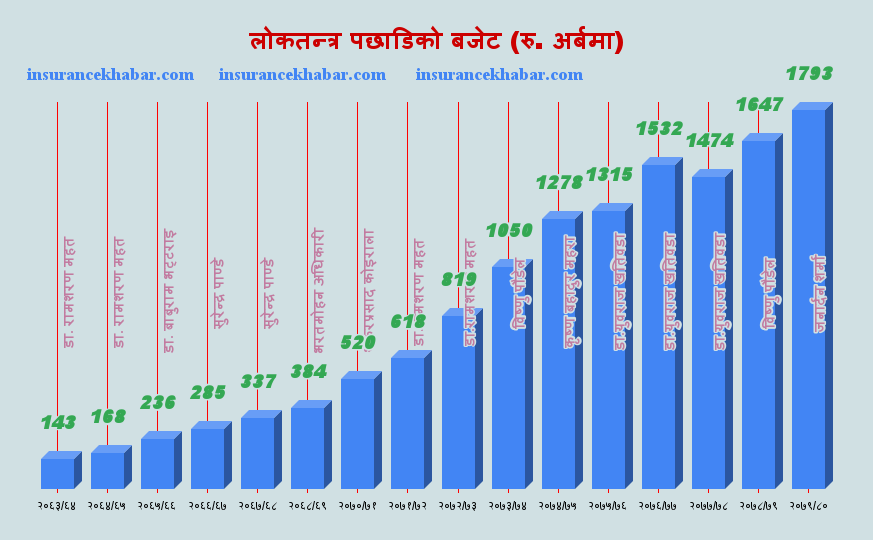 लोकतन्त्र पछिका सरकारले बजेटको आकार बढाउन थालेको पाइन्छ । माओवादी द्धन्द समाप्त भएर लोकतन्त्र स्थापना पछिको सरकारले एक खर्ब ४३ अर्ब रुपैयाँको बजेट ल्याएको थियो । त्यस पछि बजेटको आकार बढ्ने क्रम आर्थिक वर्ष २०७६/७७ सम्म निरन्तर रह्यो । खतिवडाले नै आर्थिक वर्ष २०७७/७८ मा आफैले अघिल्लो वर्षमा ल्याएको बजेटको आकार भन्दा घटाए । खतिवडाले आर्थिक वर्ष २०७७/७८ मा १४ खर्ब ७४ अर्ब रुपैयाँको बजेट ल्याएकोमा उनि पछिका अर्थमन्त्री विष्णु पौडेले ह्वातै बढाएर १६ अर्ब ४७ करोड रुपैयाँको ल्याए । यद्यमी उनले ल्याएको बजेटको आकारमा थोरैले घटाएर अर्थमन्त्री जनार्दन शर्माले कार्यान्वयन गरे ।