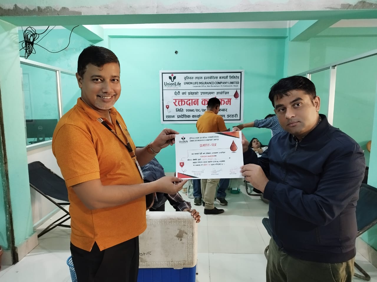 काठमाडौं । यूनियन लाइफ इन्स्योरेन्स कम्पनी लिमिटेडको प्रदेश १ को प्रादेशिक कार्यालय इटहरीले आज मंसिर ९ गते प्रदेश १ का कर्मचारी तथा अभिकर्ताहरुलाई लक्षित गरेर रक्तदान कार्यक्रम गरेको थियो । उक्त कार्यक्रमको लागी प्राविधिक सहयोगको लागि रेडक्रस सोसाइटि, इटहरीलाई आमन्त्रण गरेको थियो ।