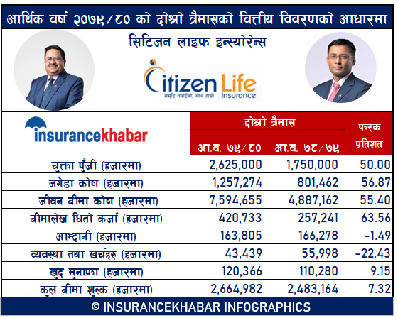 कम्पनीले चालु आर्थिक वर्षको पुष महिनासम्म २ अर्ब ६६ करोड कुल बीमा शुल्क आर्जन गर्न सफल भएको छ। गत वर्ष ६ महिनामा २ अर्ब ४८ करोड कुल बीमा शुल्क आर्जन गरेको थियो ।समिक्षा अवधिमा कुल बीमा शुल्क करीब ७ दशमलव ३२ प्रतिशतले वृद्धि भएको छ ।