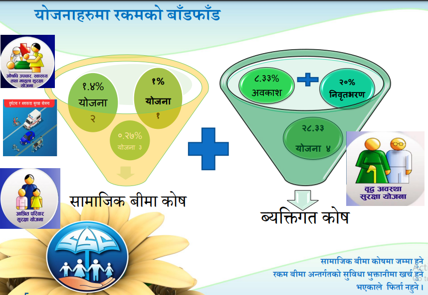 सामाजिक सुरक्षा कोषमा आधारभुत पारिश्रमिकको रोजगारदाताबाट २० प्रतिशत र कर्मचारीबाट ११ प्रतिशत सहित ३१ प्रतिशत रकम जम्मा गर्नु पर्छ । यस बाहेक कर्मचारीले स्वेच्छिक रुपमा थप गरेको रकम अवकास पश्चात प्राप्त गर्न सकिन्छ । कर्मचारीले कोषमा बुझाएको ३१ प्रतिशत रकम मध्ये २.६७ प्रतिशत रकम सुरक्षा योजनाका लागि छुट्ट्याइन्छ । जुन रकम भविष्यमा फिर्ता पाइदैन । कर्मचारीबाट संकलन गरिएको २.६७ प्रतिशत रकम पनि औषधि उपचार, स्वास्थ्य तथा मातृत्व सुरक्षा योजनाका लागि एक प्रतिशत, दुर्घटना तथा अशक्तता सुबिधा योजनाका लागि १.४ प्रतिशत र आश्रित परिवार सुविधा योजनाका लागि ०.२७ प्रतिशत रकम बाँडफाँड गरिएको हुन्छ ।