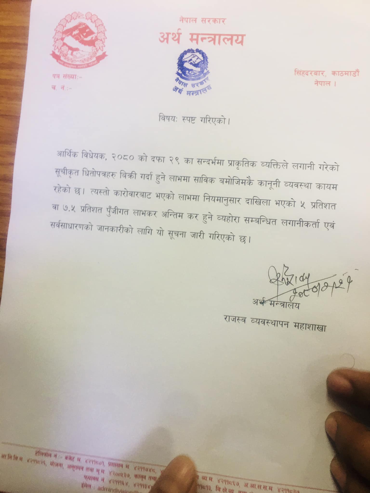 आर्थिक विधेयक २०८० को दफा २९ का सन्दर्भमा प्राकृतिक व्यक्तिले लगानी गरेको सूचिकृत धितोपत्रहरु बिक्री गर्दा हुने लाभमा साविक बमोजिमकै कानुनी व्यवस्था कायम रहेको भन्दै अर्थमन्त्रीलयले स्पष्ट पारेको छ ।