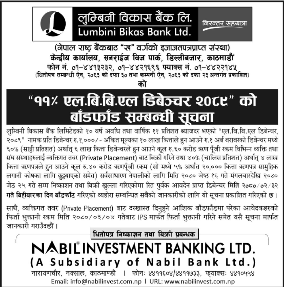 बैंकले ११ प्रतिशत ब्याजदर रहेको ‘११ प्रतिशत एलबिबिएल डिबेञ्चर २०८९’ नामको ऋणपत्र निष्काशन गरेको हो । नेपाल धितोपत्र बोर्डले बैंकलाई उक्त ऋणपत्र निष्काशनका लागि बैशाख १० गते अनुमति दिएको थियो । बैंकले ऋणपत्रबाट आर्जिन ब्याज रकम प्रत्येक आर्थिक वर्षको प्रथम अर्धवार्षिक र दोस्रो अर्धवार्षिक समाप्त भएपछि कर कट्टा गरी भुक्तानी गर्ने बैंकले जनाएको छ ।