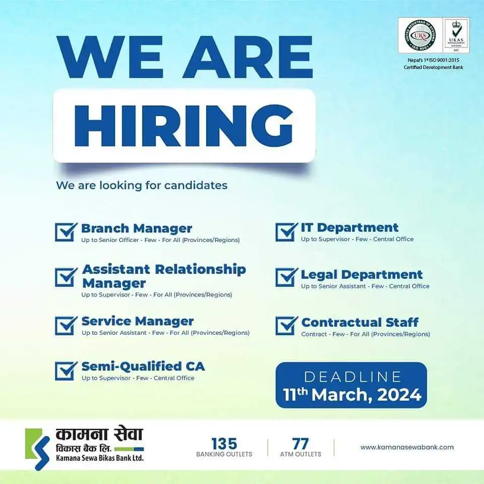 काठमाडौं । कामना सेवा विकास बैंकले माग गरेको विभिन्न पदहरका लागि दरखास्त पेश गर्ने फागुन २८ गते अन्तिम दिन रहेको छ । बैंकले ब्रान्च म्यानेजर, असिस्टेन्ट रिलेसनसिप म्यानेजर, सर्भिस म्यानेजर, सेमी क्वालिफाइड सिइए, आइटी, लेगल डिपार्टमेन्ट र कन्ट्रयाक्चुअल स्टाफका लागि दरखास्त आव्हान गरेको छ । ईच्छुक तथा योग्यता पुगेकाले फागुन २८ गतेभित्र आवेदन दिनुपर्नेछ ।