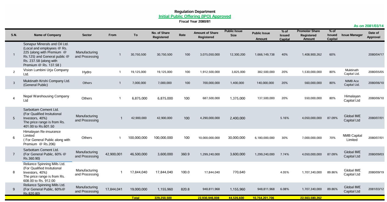 २०८० साउन १७ गतेदेखि २०८१ असार १२ गतेसम्म उत्पादन तथा प्रशोधन समूहका ३ कम्पनी, अन्य समूहका ३ कम्पनी र एउटा हाइड्रोपावर कम्पनीले अनुमति पाएका हुन्। तीमध्ये गत असार १२ गते अनुमति पाएको रिलायन्स स्पिनिङ मिल्सको आइपीओ संसदको सार्वजनिक लेखा समितिले प्रश्न उठाएपछि धितोपत्र बोर्डले रोकेको छ। बाँकी सबै आइपीओ निष्कासन भएर दोस्रो बजारमा कारोबारमा आइसकेका छन्।