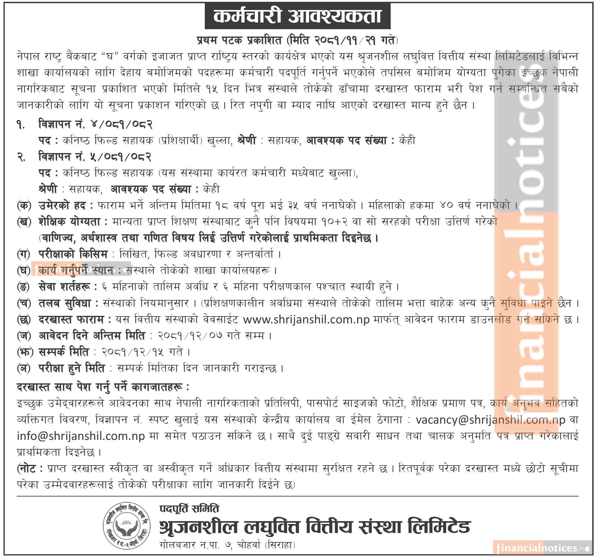 Kathmandu. Shreejansheel Laghubitta Bittiya Sanstha Limited has demanded employees. The organization has demanded a certain number of employees to fill the post of Junior Field Assistant (Trainee) through open competition.