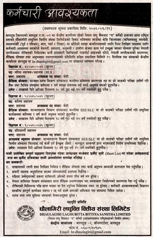 धौलागिरी लघुवित्त वित्तीय संस्था लिमिटेडले कर्मचारी माग गरेको छ । संस्थाले वरिष्ठ सहायक, कनिष्ट सहायक र प्रशिक्षार्थी सहायक पदमा केही कर्मचारी माग गरेको छ ।