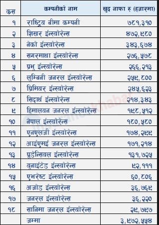 त्यसैगरि सगरमाथा इन्स्योरेन्सले २७ करोड ६५ लाख रुपैयाँ, प्रभु इन्स्योरेन्सले २६ करोड ६२ लाख रुपैयाँ , लुम्बिनी जनरल इन्स्योरेन्सले २५ करोड ९८ लाख रुपैयाँ, प्रिमियर इन्स्योरेन्ले २४ करोड ५६लाख रुपैयाँ, सिद्धार्थ इन्स्योरेन्सले २१ करोड ४३ लाख रुपैयाँ, हिमालयन जनरल इन्स्यारेन्सले १९ करोड ८५ लाख रुपैयाँ, नेपाल इन्स्योरेन्सले १८ करोड ५ लाख रुपैयाँ, एनएलजी इन्स्योरेन्ल १७ करोड ४२ लाख रुपैयाँ, आईएमई जनरल इन्स्योरेन्सले १७ करोड १२ लाख रुपैयाँ र पु्रडेन्सियल इन्स्योरेन्सले १३ करोड १७ लाख रुपैयाँ खुद मुनाफा आर्जन गर्न सफल भएका छन् ।