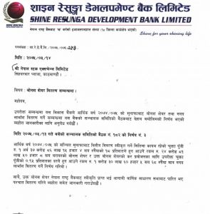 काठमाडौं: शाइन रेसुङ्गा डेभलपमेन्ट बैंकले गत आर्थिक बर्षको नाफाबाट सेयरधनीलाई बोनस शेयर प्रस्ताव गरेको छ ।