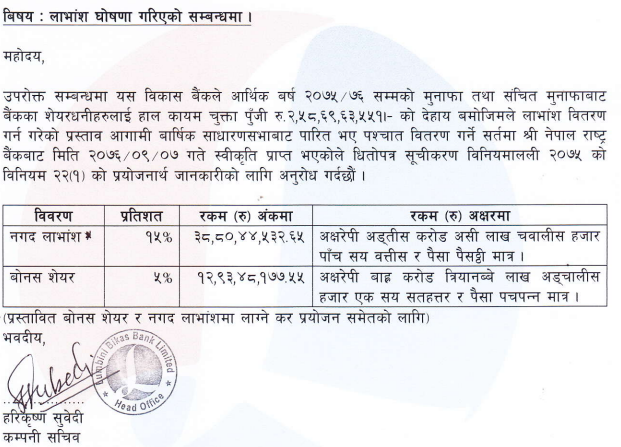 काठमाडौं । लुम्बिनी विकास बैंकको लाभांश स्वीकृत भएको छ । बैंकले आर्थिक बर्ष ७५र७६ को मुनाफाबाट लगानीकर्तालाई ५ प्रतिशत बोनस शेयर र १५ प्रतिशत नगद लाभांश वितरण गर्ने प्रस्ताव गरेको थियो ।