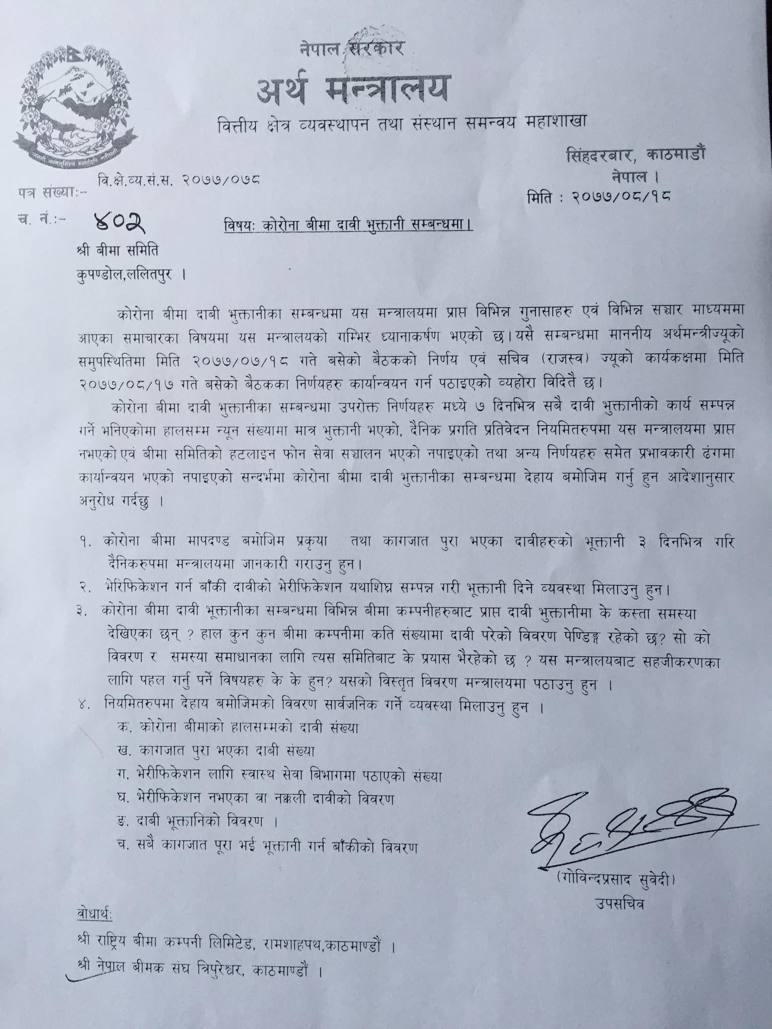 त्यस्तै मन्त्रालयले प्रमाणिकरण हुन बाँकी रहेका दावीहरुको प्रमाणिकरण तत्काल गरी दावी भु्क्तानी गर्न निर्देशन दिएको छ । साथै मन्त्रालयको निर्देशनमा दावी भुक्तानी नगर्ने कम्पनीहरुको सूचि मन्त्रालयलाई पठाउन तथा दावी भुक्तानीका समस्याहरुबारेमा जानकारी गराउन समेत निर्देशन दिइएको छ ।