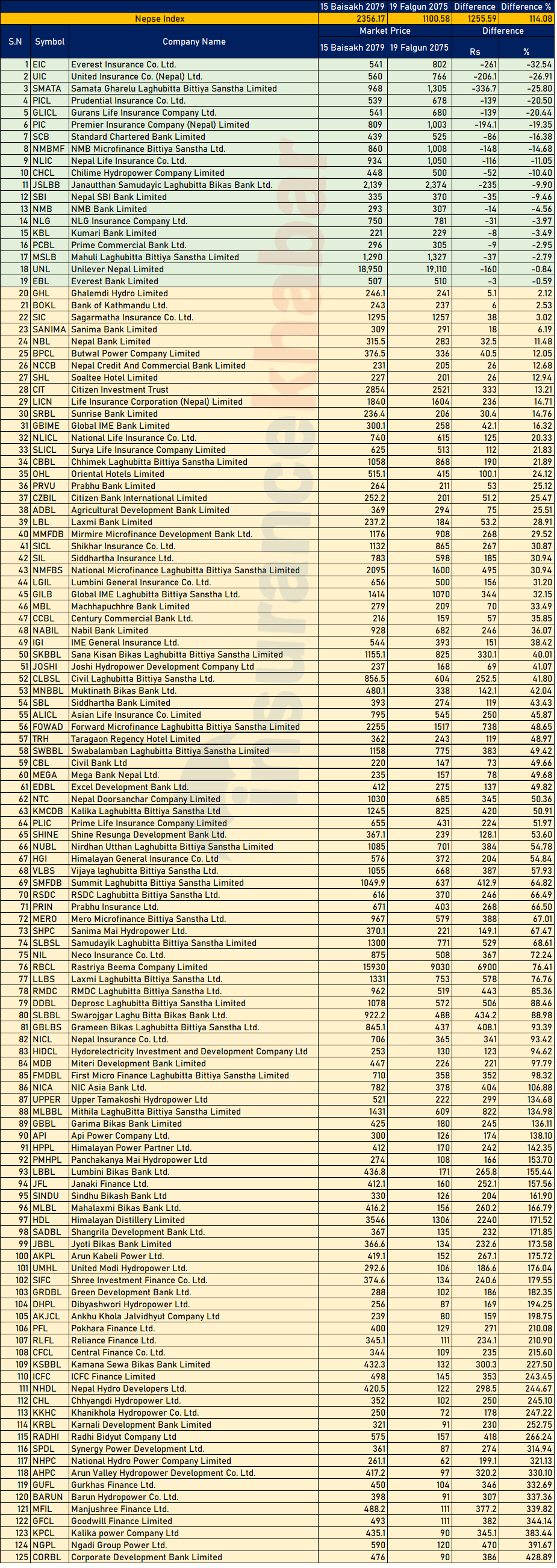 नेप्से परिसुचक ११०० पुगेको दिन भन्दा अहिले १९ कम्पनीको शेयर मूल्य सस्तो देखिएको छ । नेप्से ११०० पुगेको दिन भन्दा आज एभरेष्ट इन्स्योरेन्सको शेयर सर्वाधिक सस्तो देखिएको छ। उक्त दिन एभरेष्ट इन्स्योरेन्सको शेयर मूल्य ८०२ रुपैयाँ रहेकोमा पछिलो बजार मूल्य अनुसार कम्पनीको बजार मूल्य ५४१ रुपैयाँ रहेको छ। समिक्षा अवधिमा कम्पनीको बजार मूल्य प्रति कित्ता २६१ रुपैयाँ ( ३२ %) तल छ।