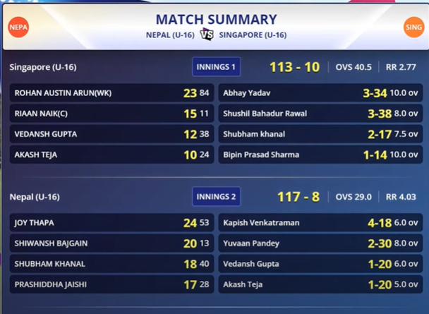 नेपालको तर्फबाट जोय थापा ५३ बलको सामना गर्दै २४ रन बनाएर मैदानमा लामो समयसम्म टिकिरहँदा ८ विकेटको क्षतिका बावजुद नेपालले लक्ष्य चुम्न सफल भएको हो। नेपालका लागि अभय यादवले अन्तिम छक्का प्रहार गर्दै नेपाललाई ११७ रनको स्कोरमा पुर्याउँदै नेपालको अपराजित यात्रालाई उचाइँमा पुर्याई दिए। यादवले कुल १२ बलमा १० रन जोडे।